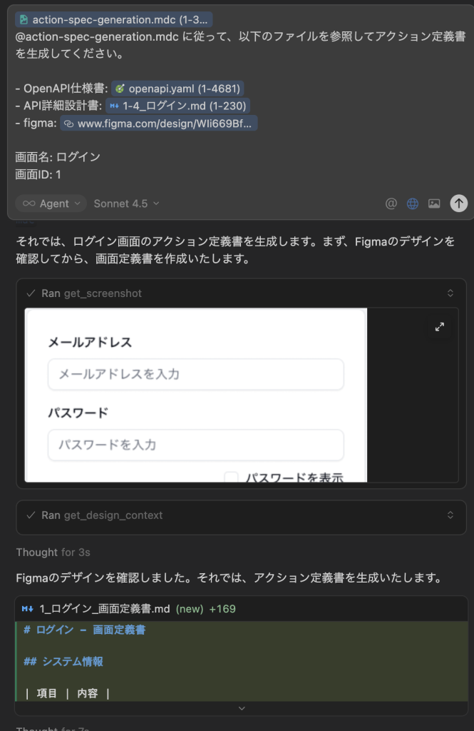 この指示により、Cursor は以下のセクションを含む完全なアクション定義書を生成します