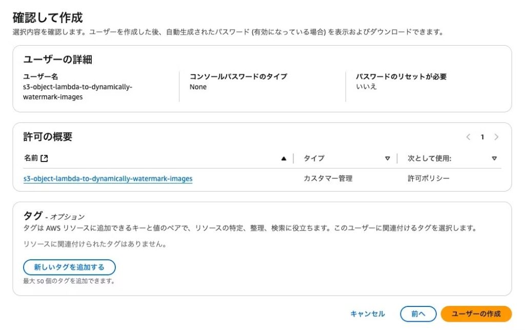 ユーザー名は s3-object-lambda-to-dynamically-watermark-imagesとします。