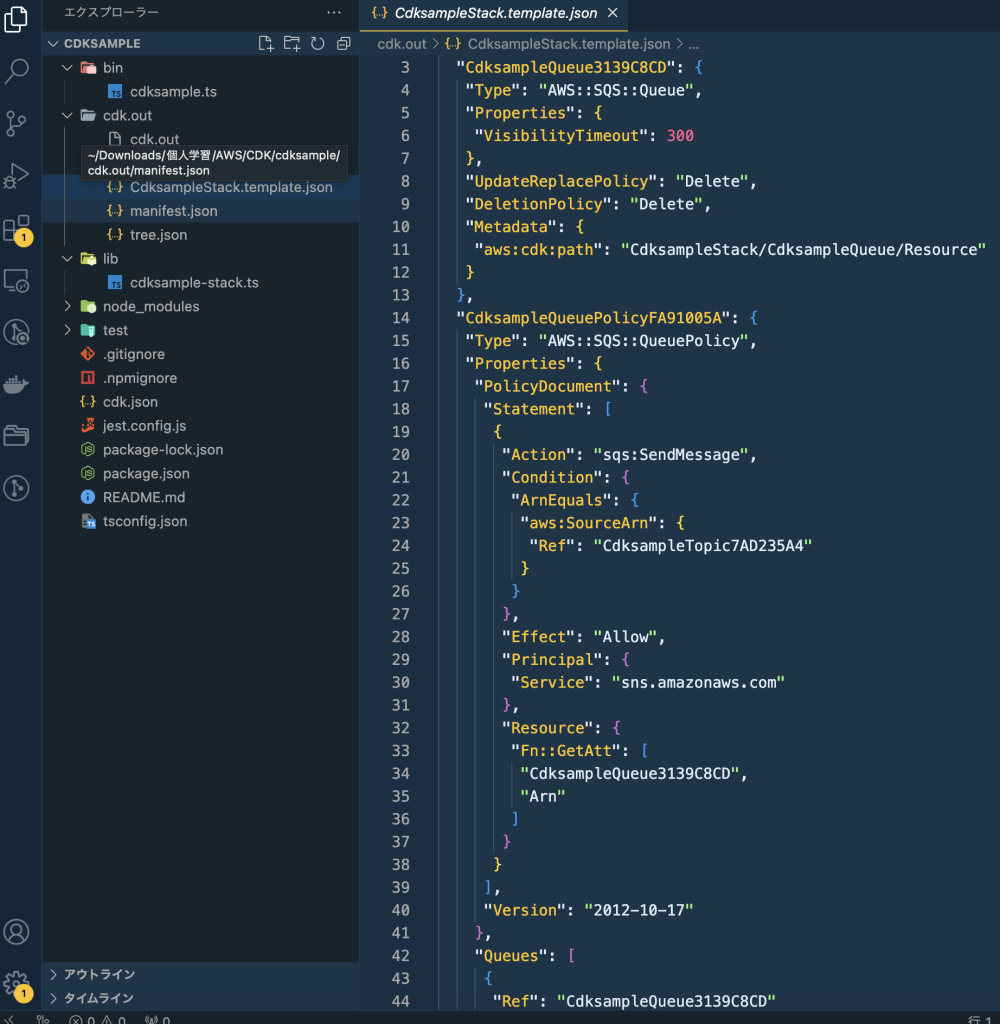 コマンドに成功するとカレントディレクトリにcdk.outフォルダが作成されます。cdk.out/〇〇.template.jsonを見るとCloudFormationテンプレートが確認できます。