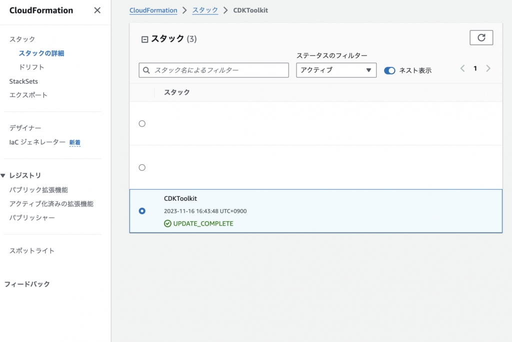 再度マネジメントコンソールでCloudFormationを確認すると、エディタで見たスタックが作成されているのが確認できるかと思います。