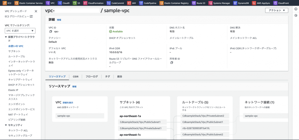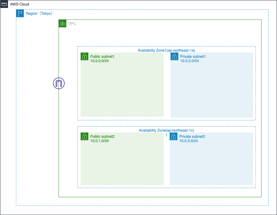 一通りcdkによるインフラ構築の流れがわかったところで、簡単な構成をCDKで構築してみます。(構成とはいっても、VPC内に2AZでサブネットを配置するだけですが…)