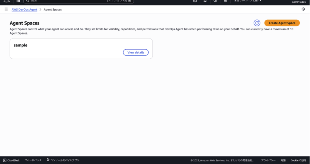マネジメントコンソールの検索バーで「DevOpsAgent」と検索し、「Create agent space」ボタンを押下します。