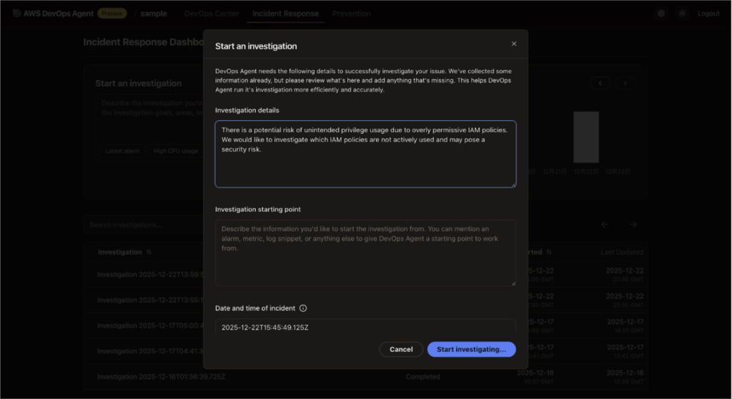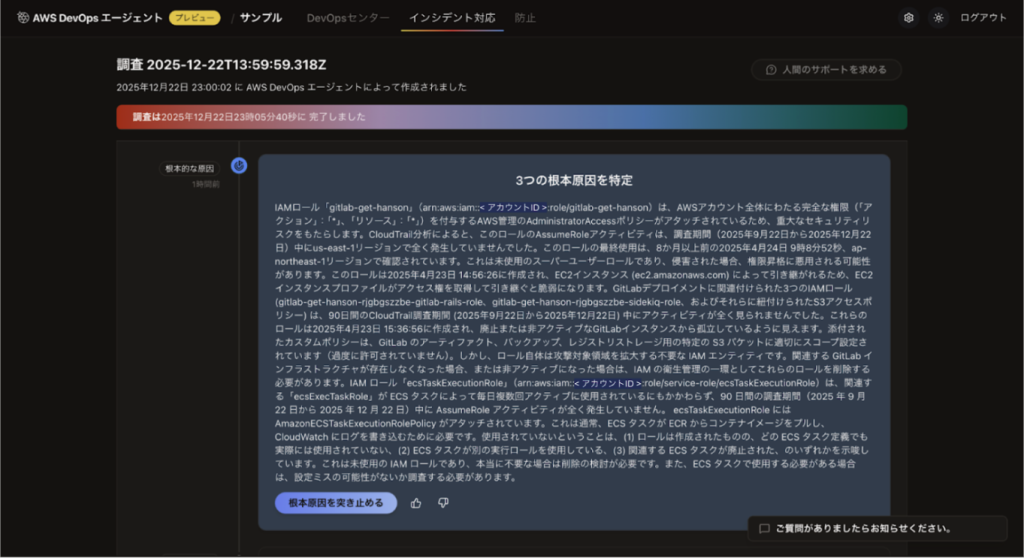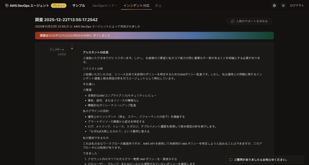 しかし DevOps Agent は 運用インシデントの調査や根本原因分析 を主な目的として設計されているため、この依頼内容は本来の設計目的とは少しズレている、と指摘されてしまいました。