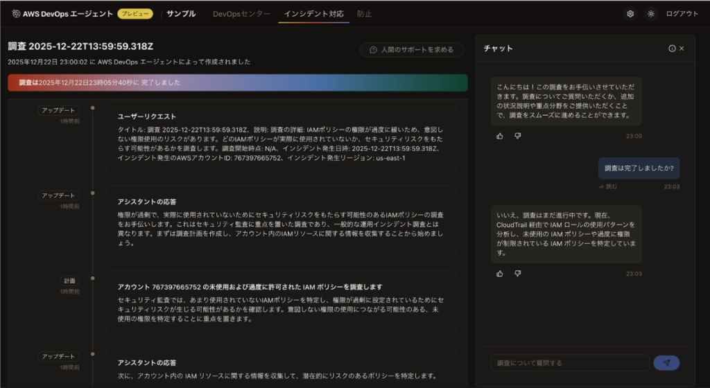 今回、AWS re:Invent 2025 で発表された新サービスの中で一番気になったAWS DevOps Agentを実際に試してみて、自然言語で調査を依頼して1分くらいできちんと調査してくれたので純粋に感動しました。速い!