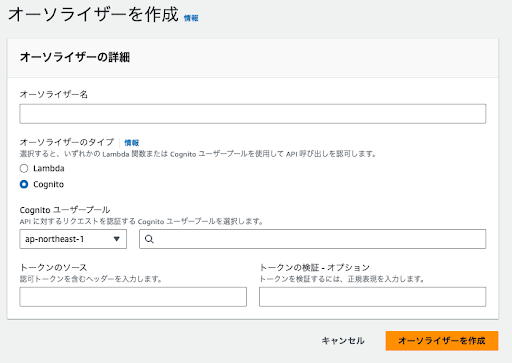 オーソライザーはCognitoでユーザープールを選択します。トークンのソースはヘッダーで認証情報を載せるキーを指定します。