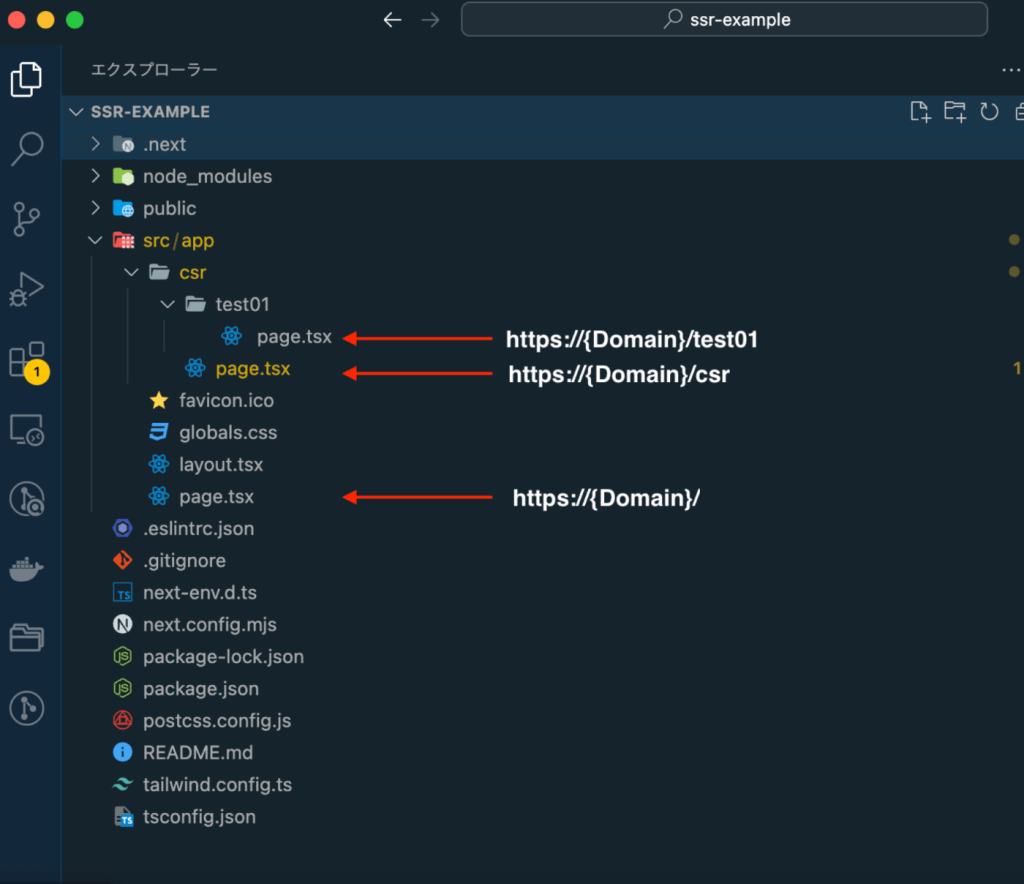 pageをつける必要があります。 - 原則として、 <span style=”color:#d70910;”>全てのReactコンポーネントをサーバー側でレンダリングします。</span>(デフォルトがサーバーコンポーネント)(次のセクションで説明します)