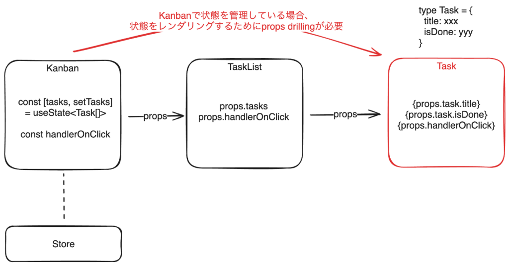 - 状態やロジックを上層コンポーネントの一箇所で管理している場合、下層コンポーネントまで状態やロジックをバケツリレーする必要がある