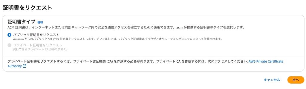 証明書タイプは「パブリック証明書をリクエスト」のまま進み、