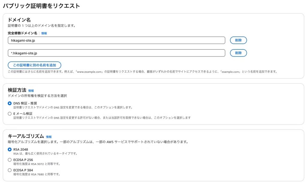 完全修飾ドメイン名には、「hikagami-site.jp」および「*.hikagami-site.jp」と入力します。(ドメイン名は自身の所持するものに書き換えてください)