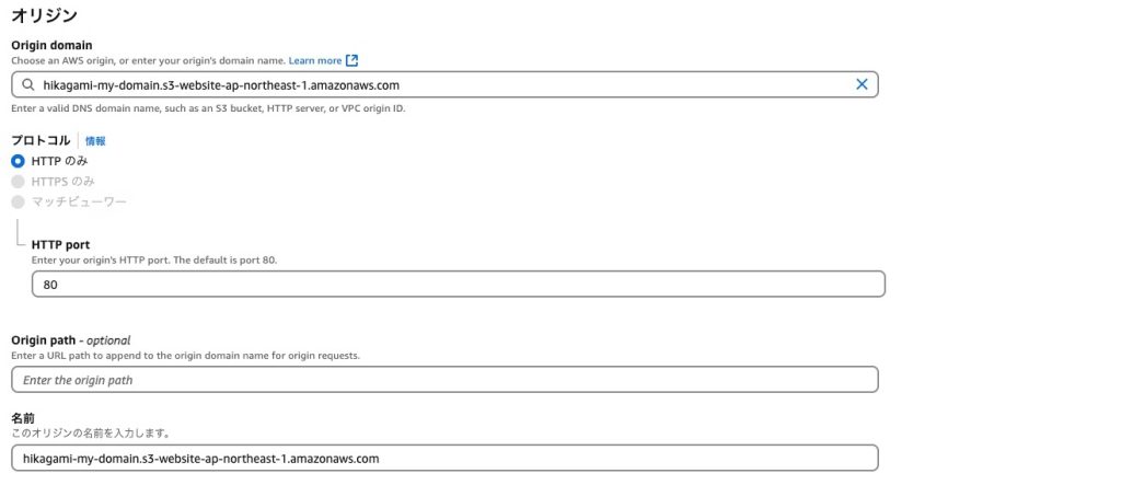 オリジン > Origin domainには、S3静的ウェブサイトホスティングの際に公開されたURLを選択します。
