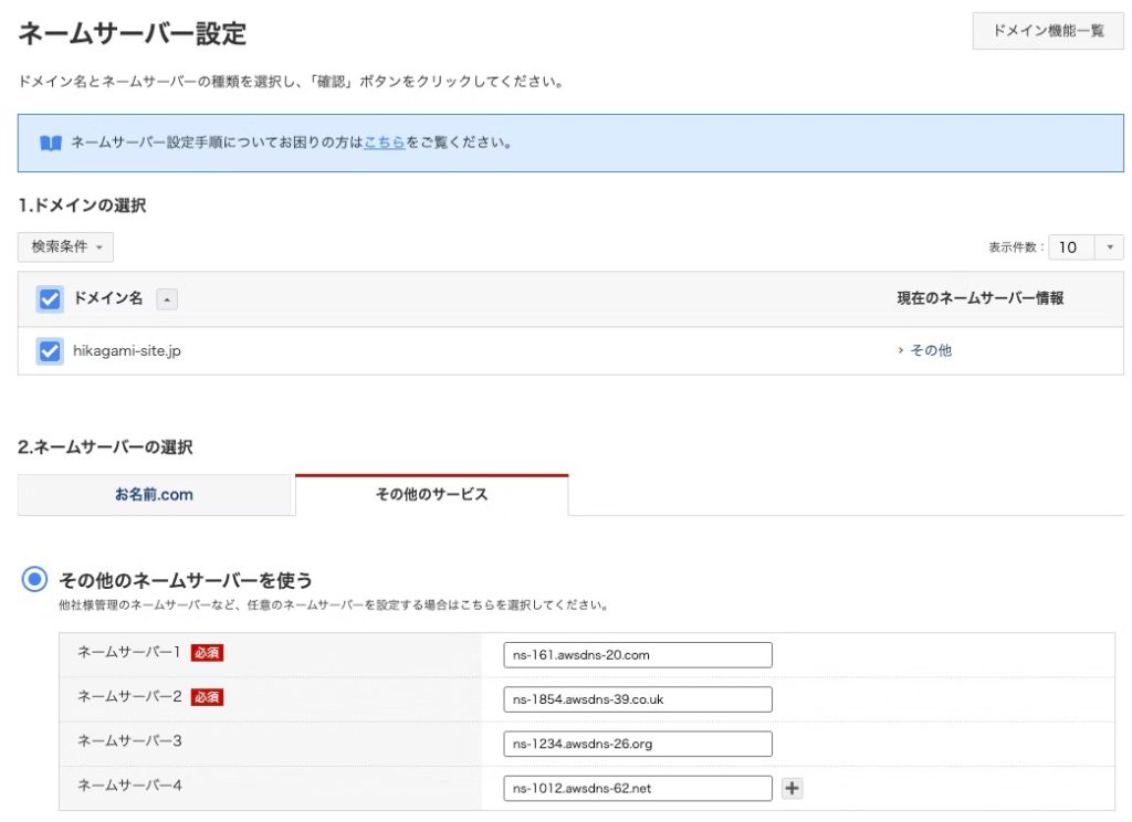 ドメイン名にチェックを入れ、ネームサーバーの選択 > その他のサービスで先ほどのns-ではじまる4つの値を入力します。