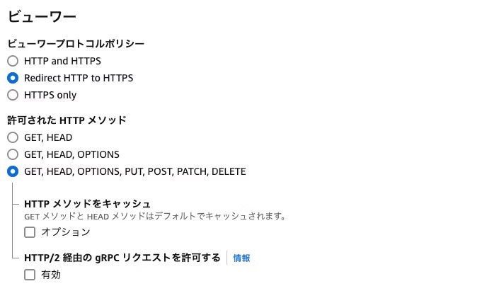 ビューワー > ビューワープロトコルポリシーでは「redirect HTTP to HTTPS」を、許可されたHTTPメソッドでは「GET, HEAD, OPTIONS, PUT, POST, PATCH, DELETE」を選択します。