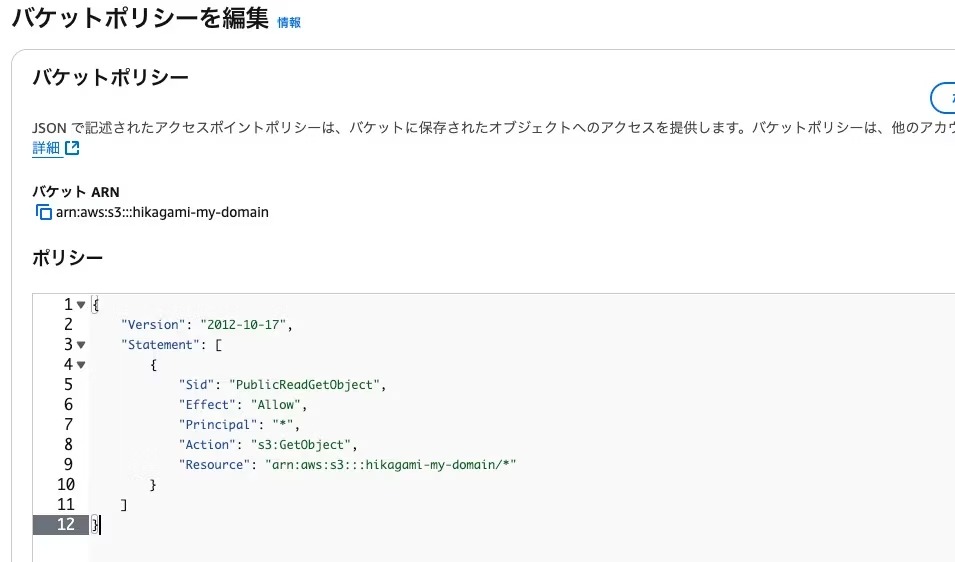 {バケット名}の部分には、S3のバケット名を入れてください。(今回なら"arn:aws:s3:::hikagami-my-domain/*"となります)