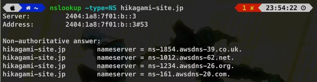 nslookup -type=NS hikagami-site.jpをターミナルで実行すると、しっかり先ほど設定したNSレコードの値が返却されています。