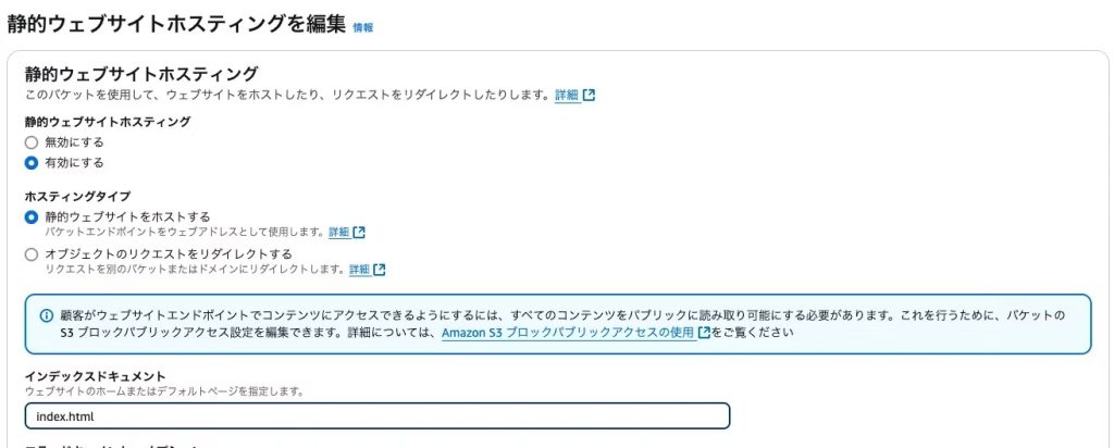 「静的ウェブサイトホスティング」を有効に、インデックスドキュメントはindex.htmlとしておきましょう。