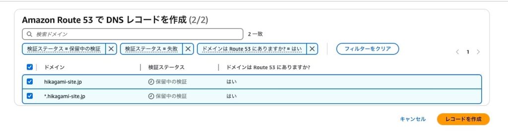 対象のドメインにチェックをいれ、レコードを作成ボタンを押下します。