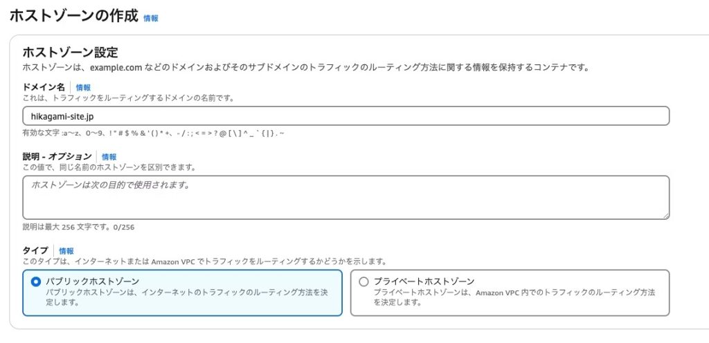AWSマネジメントコンソールでRoute53 > ホストゾーン > ホストゾーンの作成ボタンを押下し、情報を入力します。