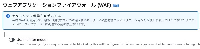 ウェブアプリケーションファイアウォール(WAF)は「セキュリティを有効にする」を選択しておきましょう。