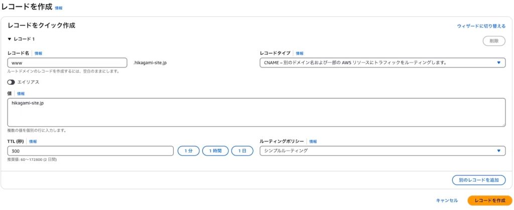 レコードを作成ボタンを押下し、レコード名には「www」を、レコードタイプは「CNAME」を選択し、値にはルートドメインである「hikagami-site.jp」を入力します。