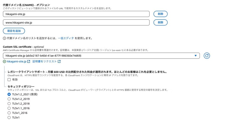 設定 > 代替ドメイン名には「hikagami-site.jp」とサブドメインも対応したいので「www.hikagami-site.jp」を入力し、Custom SSL certificateには先ほどACMで作成した証明書を選択します。