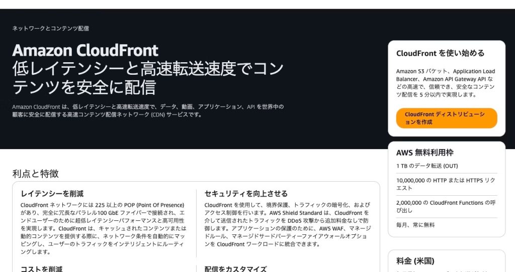 AWSマネジメントコンソールから、CloudFront > ディストリビューション > ディストリビューションを作成ボタンを押下します。