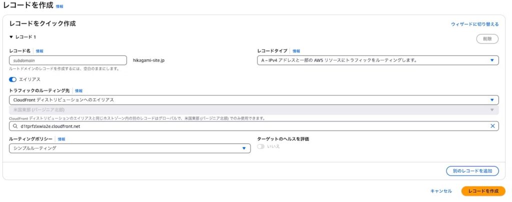 トラフィックのルーティング先には、先ほど作成したCloudFrontディストリビューションを選択します。