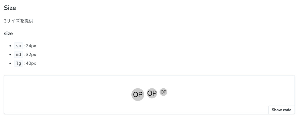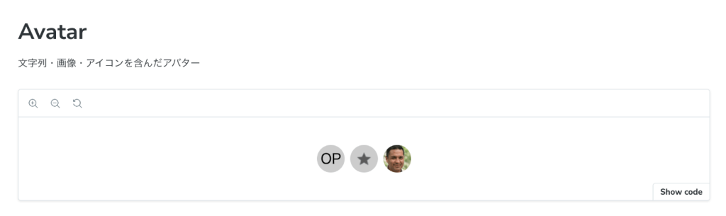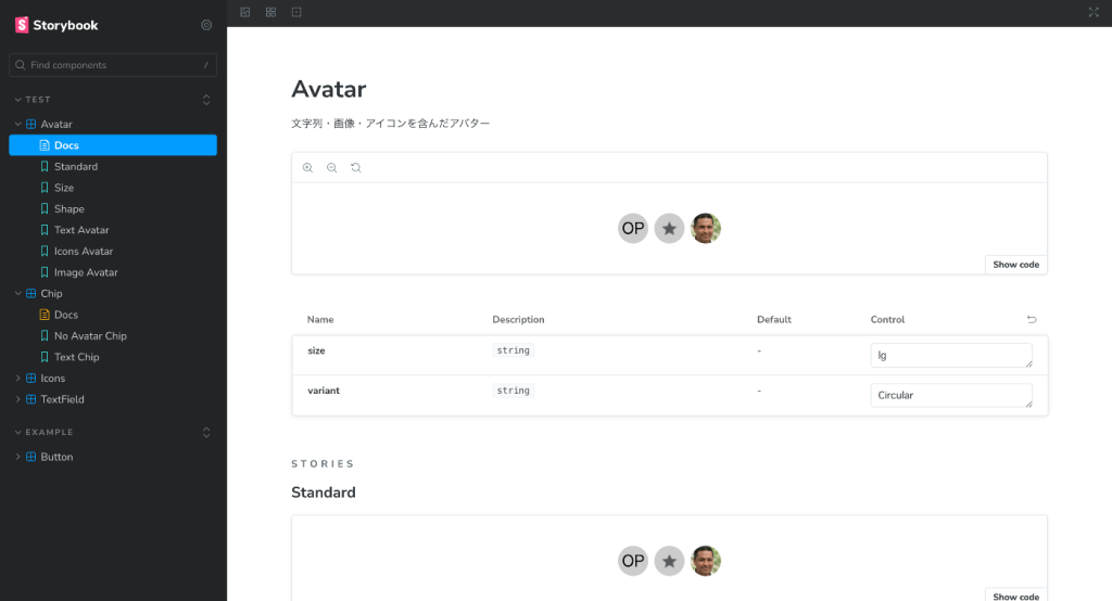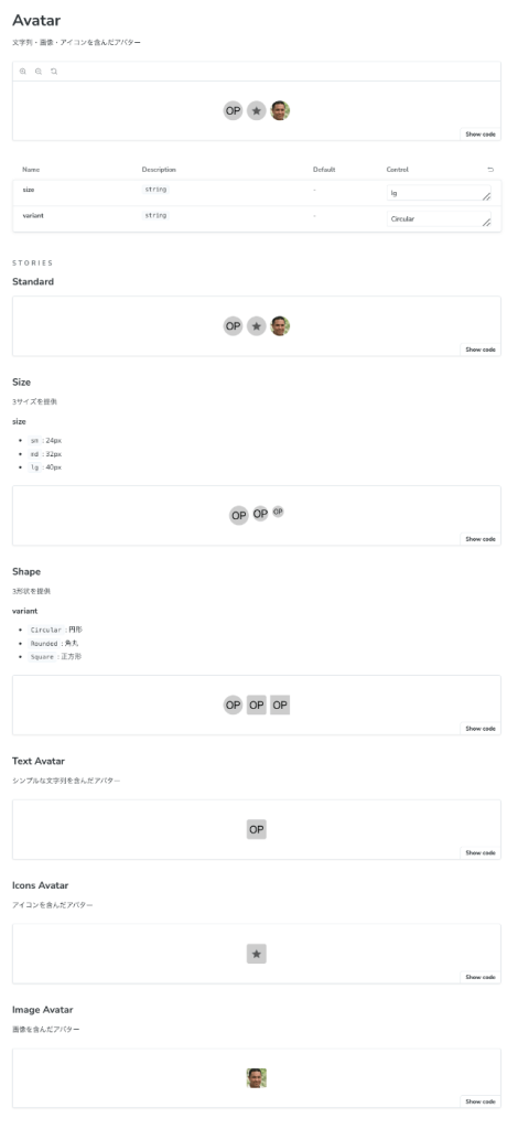 例えば、以下のAvatarコンポーネントに対して、以下のバリエーションをストーリーとして作ってあげると、、、